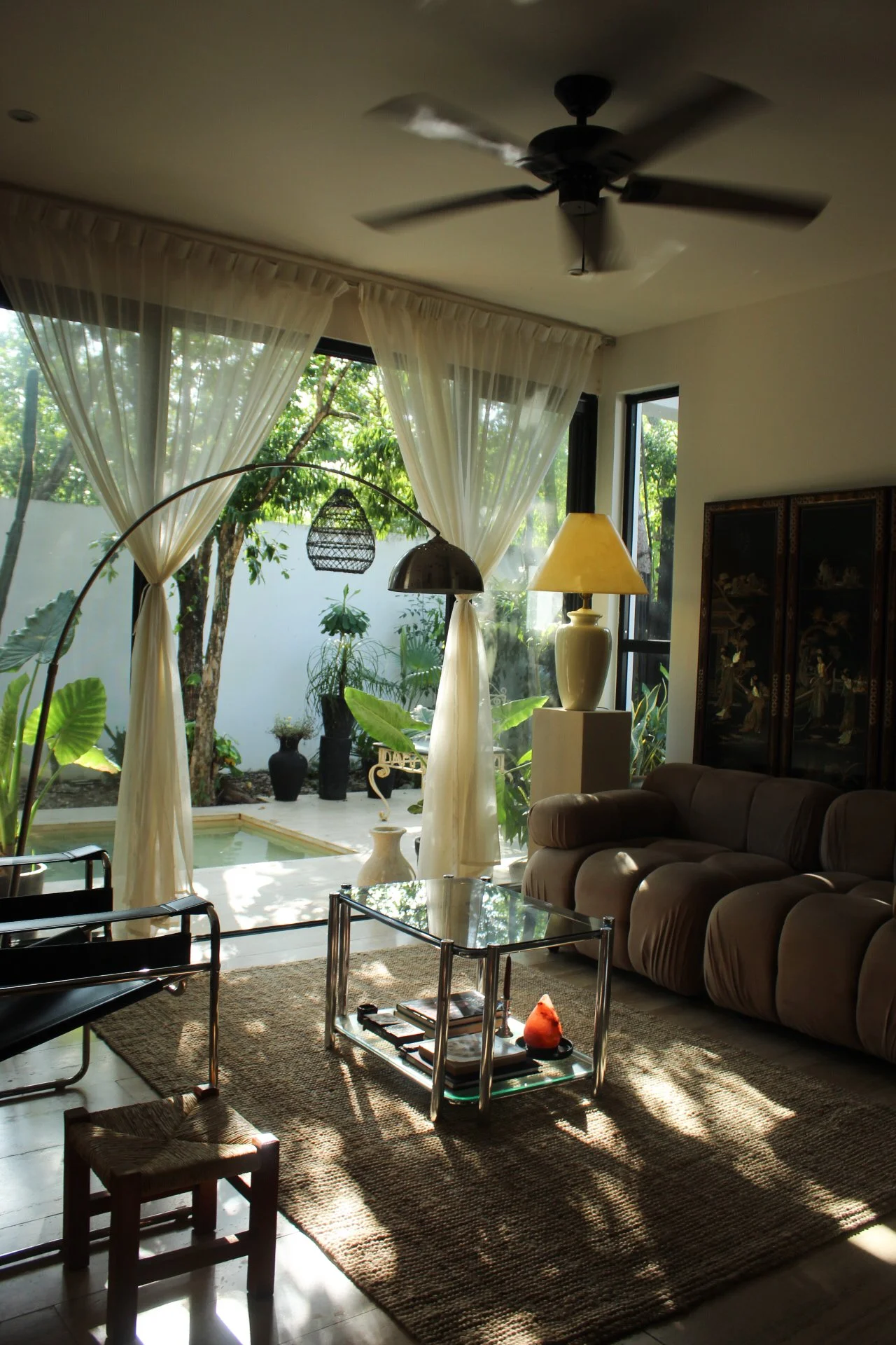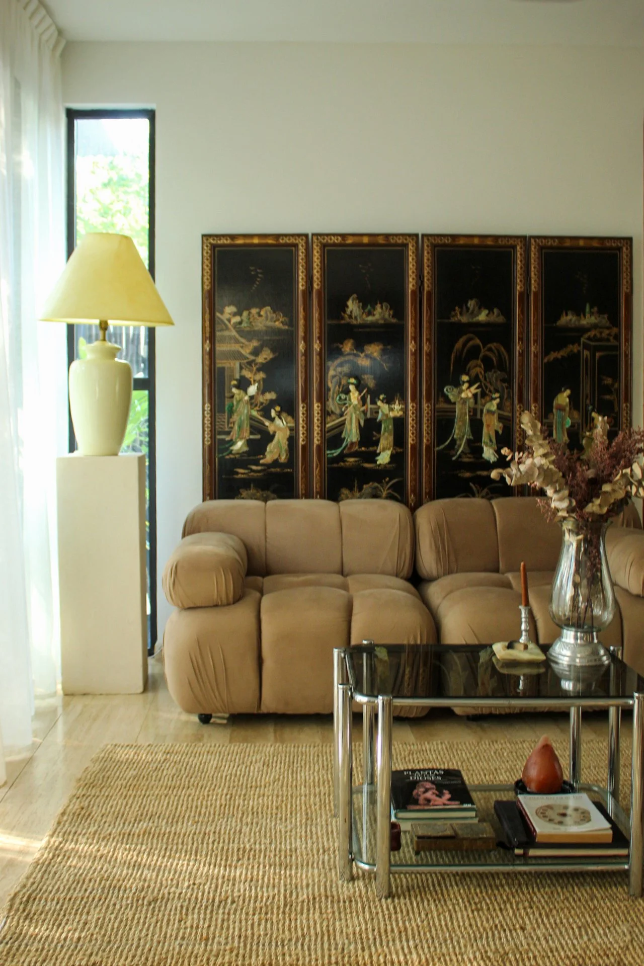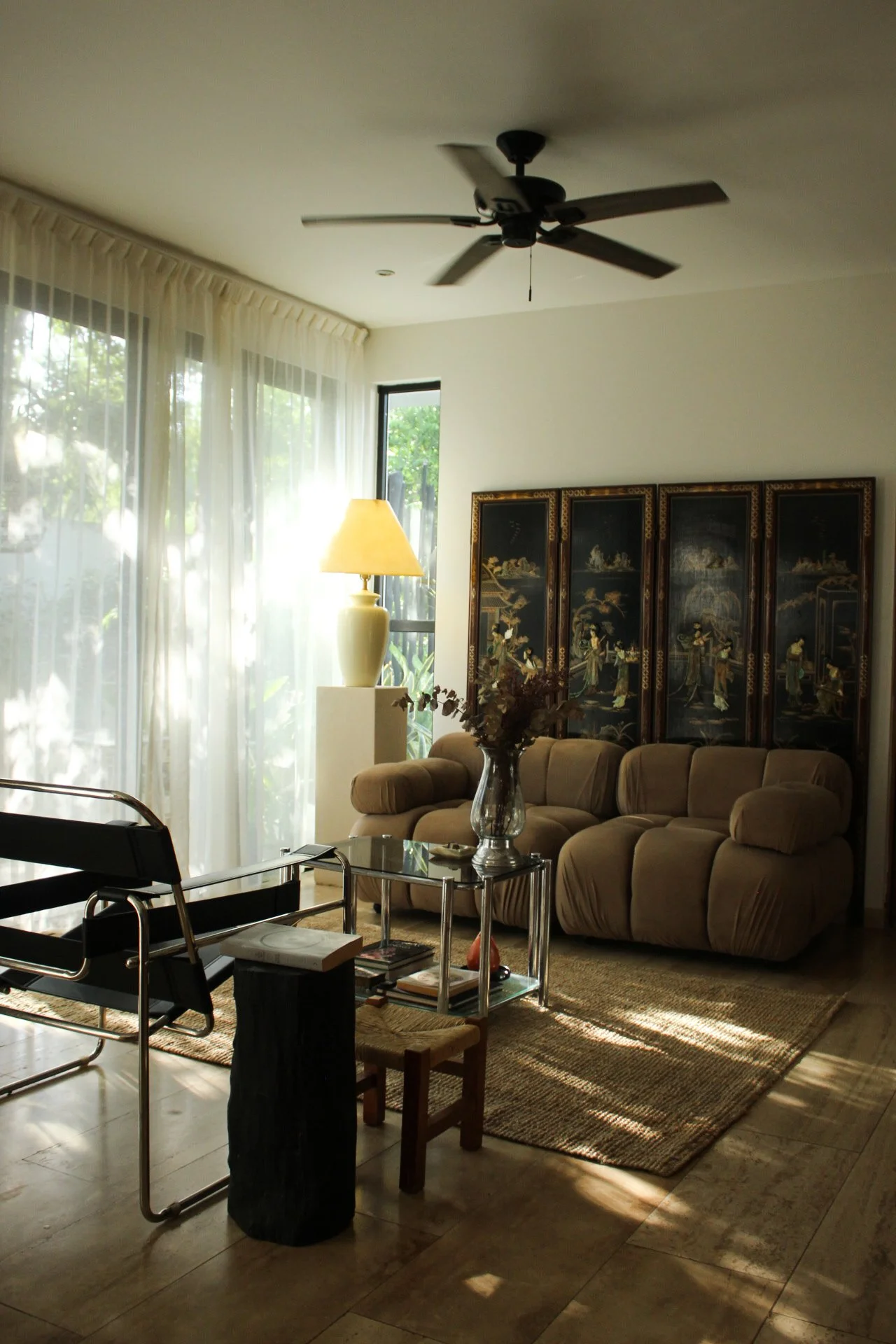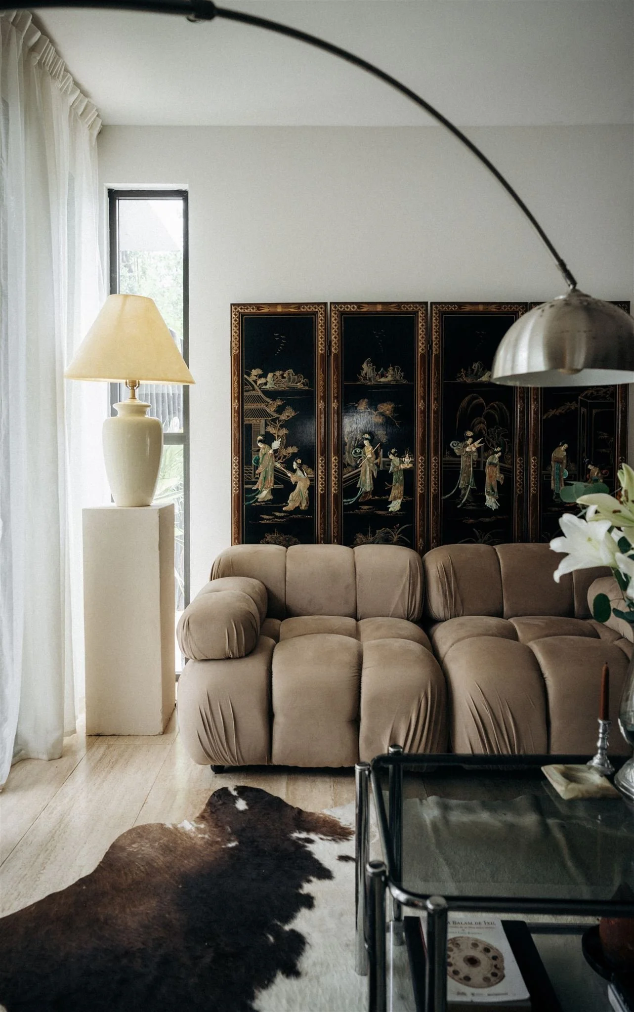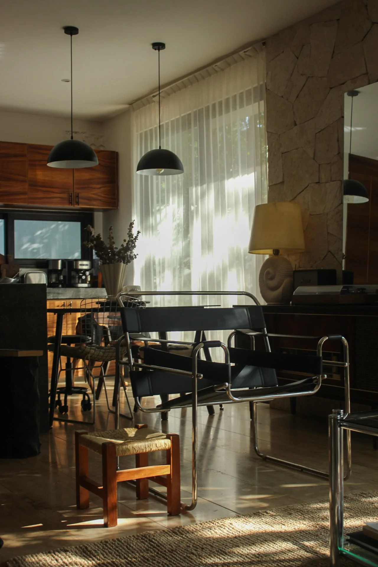 Aquí conviven piezas que son íconos del diseño internacional, como la silla Wassily de Marcel Breuer, la Diamond Chair diseñada por Harry Bertoia en 1950 o el sofá modular de Mario Bellini, que aportan historia y carácter a cada rincón. Estas se mezclan con hallazgos vintage, como una consola original de los años 60’s, y tesoros decorativos cargados de simbolismo, como un biombo oriental del siglo XX.
